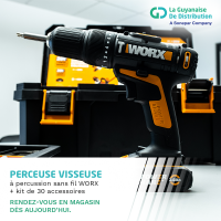 Découvrez notre perceuse visseuse à percussion sans fil de la gamme WORX avec son kit de 30 accessoires ! Un kit complet idéal pour des travaux de bricolage, de décoration et transportable lors de tous vos déplacements : Perceuse visseuse à percussion 20V2 batteries de 2 Ah compatibles